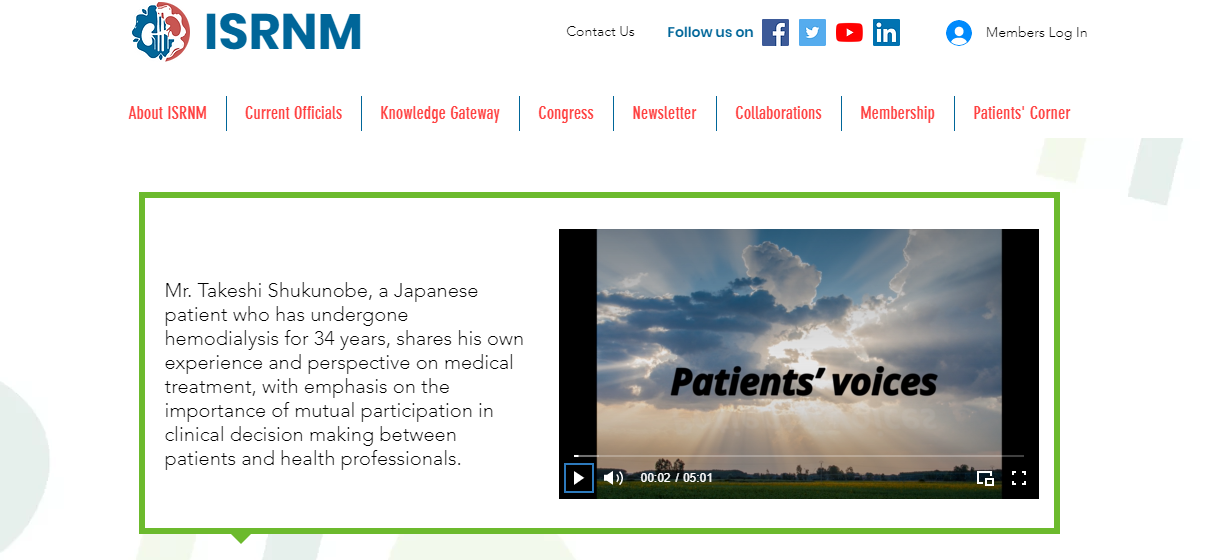 国際腎臓栄養代謝学会(ISRNM)のホームページ「Patient’s Voice」のコーナーに、東京医療保健大学 准教授 管理栄養士 北島幸枝氏によるインタビュー動画(5分1秒)が掲載されました。