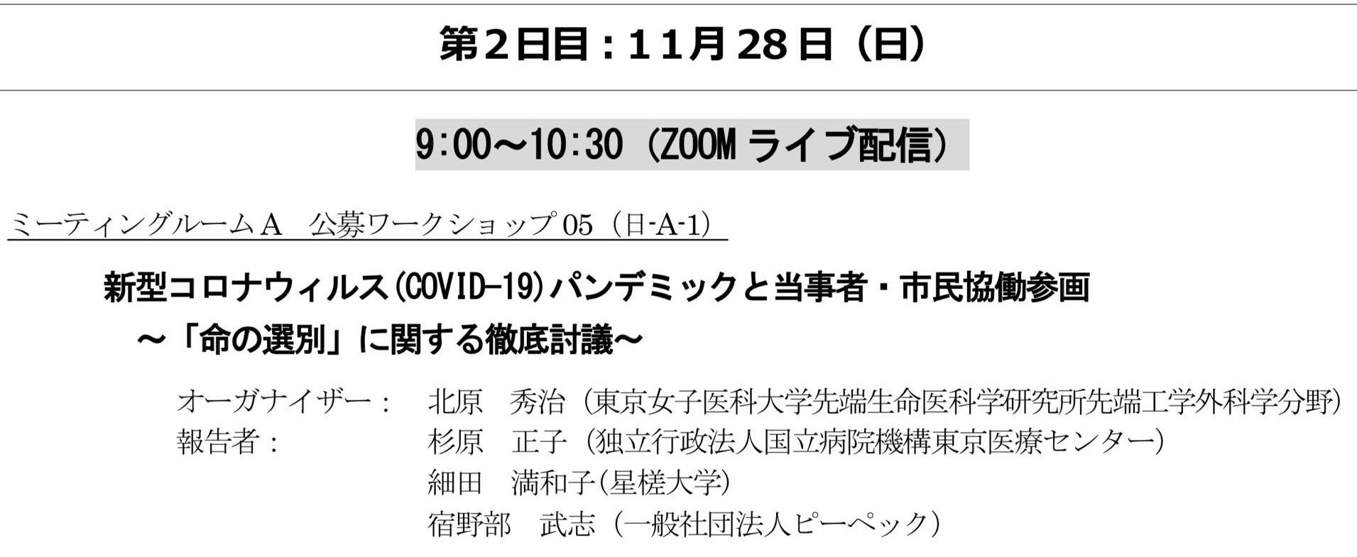 宿野部が幹事を務める「当事者・市民協働参画を考える部会」が企画した公募ワークショップ「新型コロナウィルス(COVID-19)パンデミックと当事者・市民協働参画~「命の選別」に関する徹底討議~」への登壇と、学会企画シンポジウム「終末期と看取りの転換期?熟議と設計を問い直す」での指定発言を行いました。