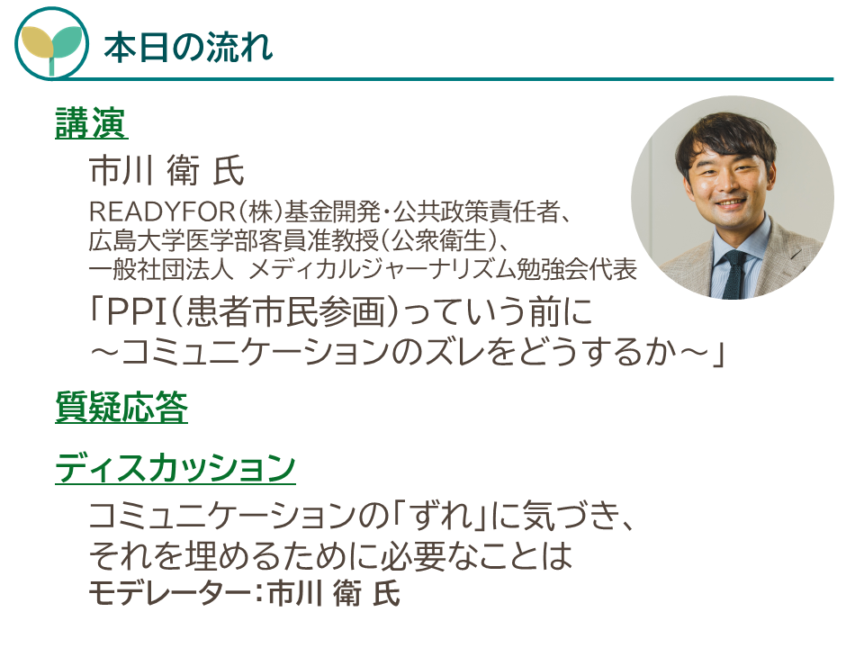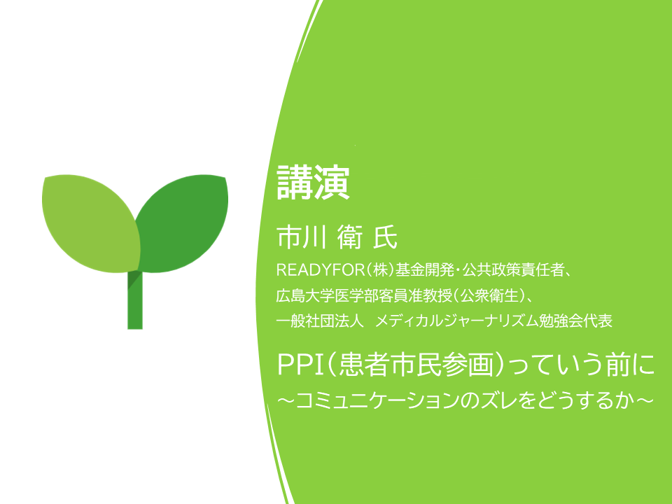 最初に、講師にREADYFOR(株)基金開発・公共政策責任者、広島大学医学部客員准教授(公衆衛生)、一般社団法人メディカルジャーナリズム勉強会代表 市川 衛氏をお迎えし、「PPI(患者市民参画)っていう前に~コミュニケーションのズレをどうするか~」と題してご講演いただきました。