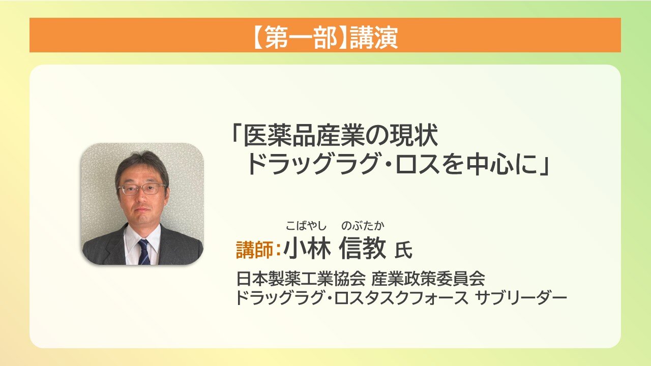 まず、日本製薬工業協会 産業政策委員会 ドラッグラグ・ロス タスクフォース サブリーダー 小林信教氏より、「医薬品産業の現状 ドラッグラグ・ロスを中心に」と題して、ドラッグラグとドラッグロスの定義、歴史的経緯、現在の課題や取り組みについて講演いただきました。