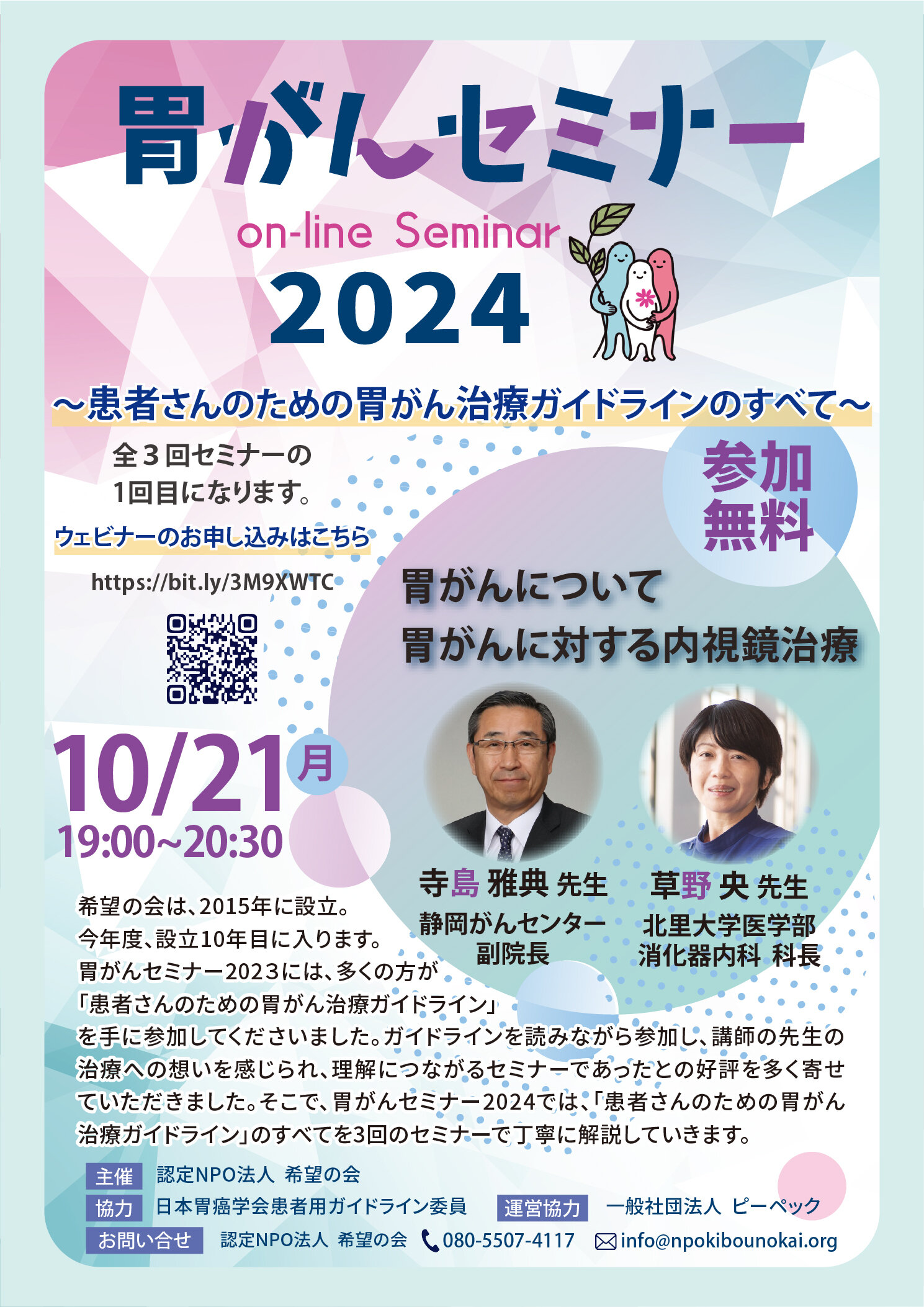 【終了】<希望の会>10月21日開催イベント「胃がんセミナー2024~患者さんのための胃がん治療ガイドラインのすべて」を開催します。