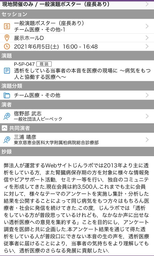 2021年6月5日、第66回日本透析医学会学術集会にて代表理事 宿野部がポスター発表しました。