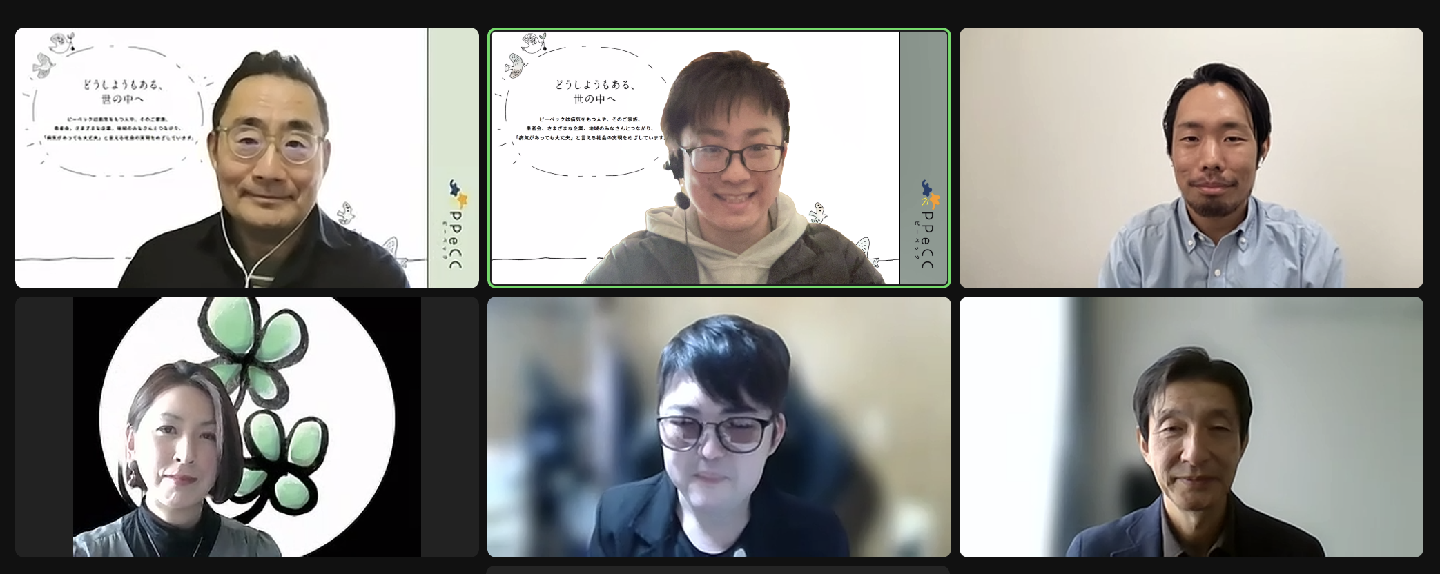 講演を受けてのディスカッション、質疑応答では、ピーペック代表理事の宿野部武志がモデレーターを務め、講師の2名に加え、アステラス製薬株式会社 東山 浩之氏、PPHプロジェクトに参画する病気をもつ当事者の吉岡 紀子氏、様々なバックグラウンドをもつメンバーで意見交換を行いました。