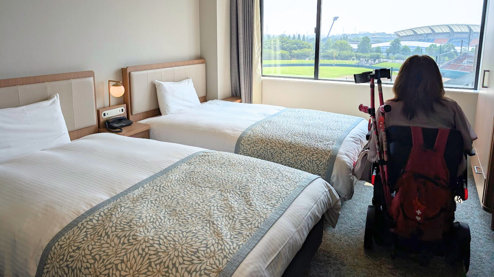オストメイト対応の便器や角に丸みをもたせたテーブル、車椅子でも通りやすい広い入口、全客室に常設の体重計やプルトップオープナーなど、一般的なホテルとは異なる細やかな工夫に、誰もが安心して快適に過ごせるための配慮が現れていました。